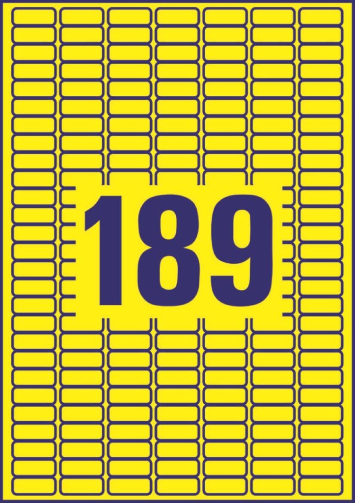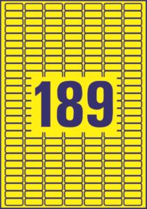 rozměr 25,4×10 mm, 20 archů A4, 3.780 ks etiket v balení (189 ks/arch), papírové, snímatelné lepidlo, barva žlutá. Typ tiskárny: černobílá laserová, barevná laserová, inkoustová.
