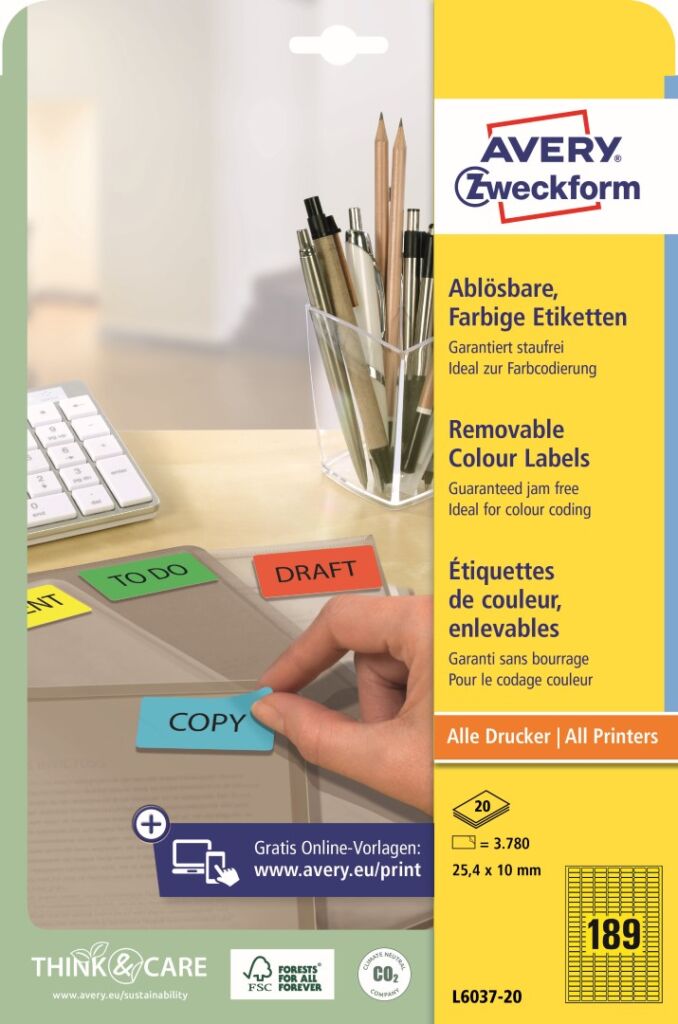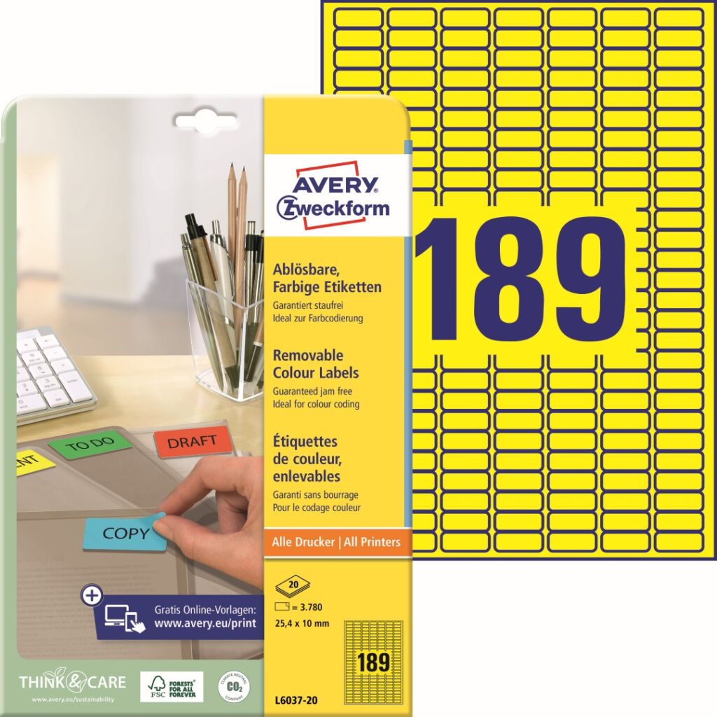 Žluté odnímatelné etikety Avery Zweckform L6037-20 do kanceláře, obchodu i domácnosti, ideální na veškeré dočasné nebo měnící se značení. Etikety se snímatelným lepidlem spolehlivě a bezpečně drží, a naopak je můžete snadno odlepit, bez zanechání žádných stop zbytkového lepidla. Ukázka viz Videa (záložka výše). Při tisku se můžete spolehnout na plynulý průjezd archů tiskárnou bez uvíznutí a ostrý tiskový výstup, který se díky vynikajícímu ukotvení tonerového prášku či inkoustu nerozmazává. Samozřejmostí je čtyřstranný bezpečnostní okraj QCT (Quattro Clean Technology), který zabraňuje vytékání a usazování lepidla v tiskárně. Žluté snímatelné etikety Avery Zweckform L6037-20 jsou vhodné pro všechny běžné laserové i inkoustové tiskárny, kopírovací stroje a hodí se i pro psaní, resp. ruční popis.