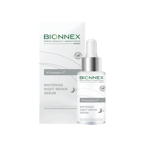 Bionnex Whitexpert bělící noční sérum redukuje pigmentové skvrny, rozjasňuje pleť a podporuje její regeneraci. Obsahuje výtažek z houby čaga, kurkumu a vitamin C, které regulují tvorbu melaninu a sjednocují tón pleti. Vhodné i pro citlivou pleť.