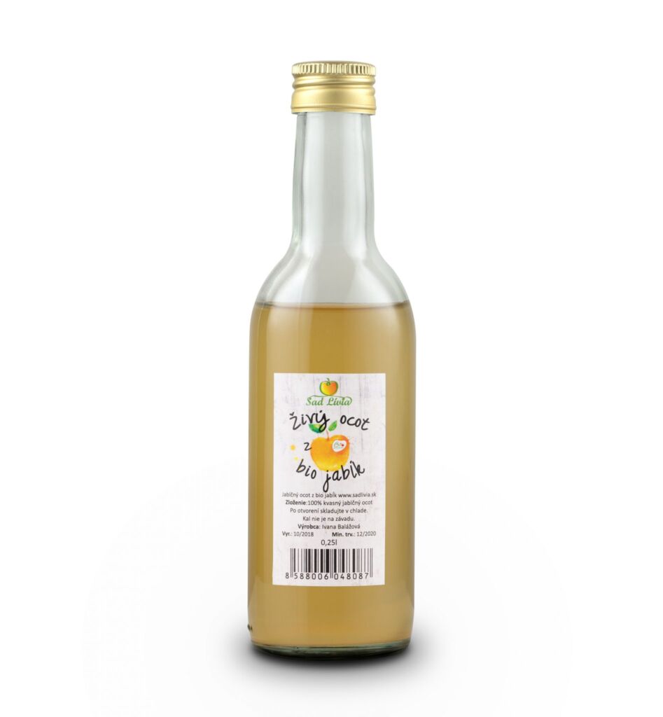 Bio jablečný ocet (6%) nefiltrovaný, nepasterizovaný - vyrobený z domácí produkce kvalitního jablečného moštu ze Slovenských jablek vypěstovaných bez použití pesticidů a jiných chemických látek. Podporuje tvorbu žaludečních šťáv a tím i účinky mastichové terapie.