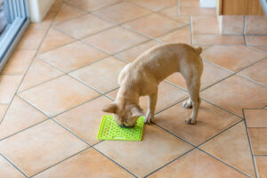 LickiMat Wobble je miska s gumovými bodlinkami uvnitř. Můžeme ji natřít arašídovou pastou, rybičkami z konzervy i mletým masem, nejideálnější je pro tekuté záležitosti, obzvláště pro jejich zamražení. Zkuste na sebe udělat několik vrstev, aby se pejsek s každým dalším líznutím přiblížil novému chuťovému zážitku a vy jste měli několik hodin klid.
