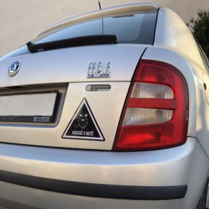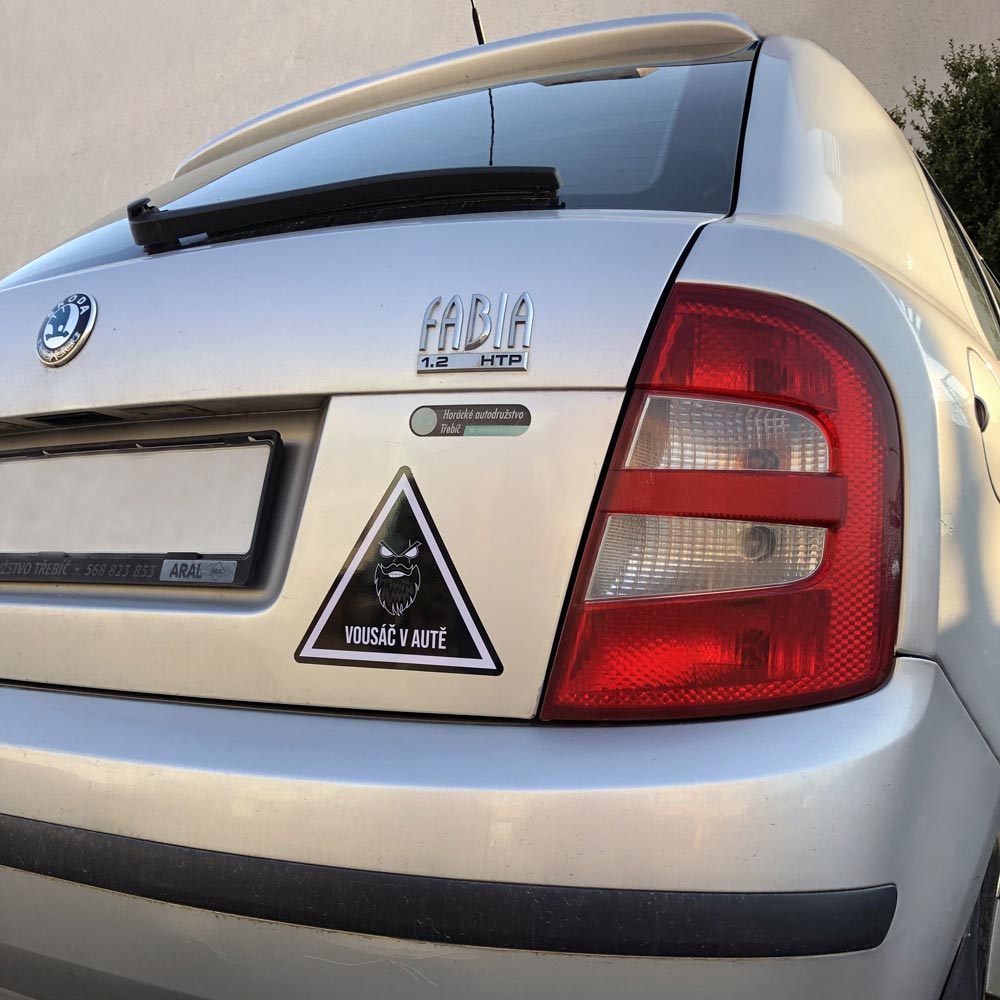 Trojúhelníkovou nálepku Vousáč v autě můžete vyměnit za stávající Dítě v autě, případně jestli nemáte žádnou, tak není o čem a už tam má být nalepená.