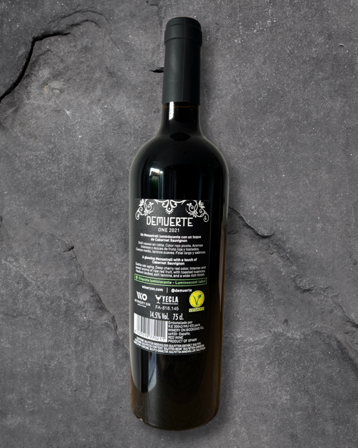 Vinice v oblasti D.O. Yecla, s jejich vápenitými půdami a extrémním klimatem, poskytují ideální podmínky pro vznik vína s autentickým středomořským charakterem. DEMUERTE ONE je nejen chuťovým, ale i vizuálním zážitkem – víno, které spojuje vášeň, kvalitu a smysl pro detail.