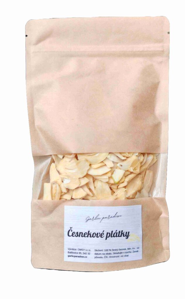 Jsou sušené plátky kvalitního českého česneku z domácí výroby. Tyto křupavé aromatické plátky představují praktickou alternativu k čerstvému česneku, ideální pro rychlé použití při vaření bez nutnosti loupání česneku.