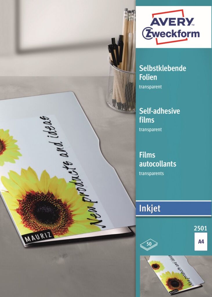 Samolepící fólie Avery Zweckform 2501 jsou ideální pro tvorbu a tisk vlastních barevných samolepek. Po nalepení téměř neviditelné, logo nebo text vypadá, jako by byl natištěn přímo na podkladu. Samolepící fólie pro inkoustové tiskárny mají speciální fotokvalitní povrchovou úpravu pro vynikající reprodukci a sytost barev, ostré kontury tisku a vynikající přilnavost toneru, zabraňující rozmazávání či stékání inkoustu. Průhledné samolepící fólie Avery 2501 jsou vhodné pro všechny běžné inkoustové tiskárny. Fólie stačí jednoduše vložit do zásobníku na papír a bez problémů můžete potisknout i větší počet fólií najednou.