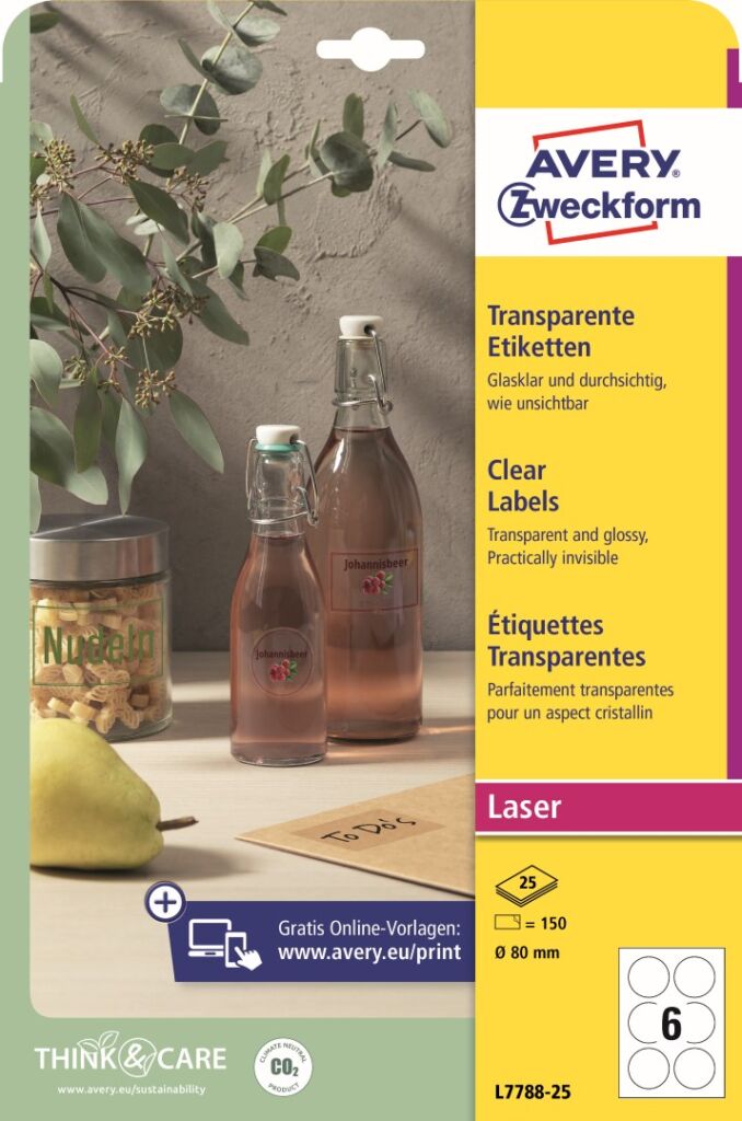 Čiré kulaté etikety Avery Zweckform L7788-25 jsou vyrobeny z lesklého, průhledného materiálu, poskytující jedinečný a luxusní vzhled Vašim výrobkům, obalům zboží, kancelářskému vybavení atd. Spolehlivá a stálá lepivost na různých typech povrchů, vhodné na sklo, plast, kov a jiné leštěné povrchy. Po nalepení téměř neviditelné. Průhledné polyesterové etikety jsou odolné proti stříkající vodě, znečištění, mastnotě, natržení a teplotám od -20°C do +80°C. Při tisku se můžete spolehnout na plynulý průjezd archů tiskárnou bez uvíznutí a ostrý tiskový výstup, který se díky vynikajícímu přilnutí tonerového prášku nerozmazává. Samozřejmostí je čtyřstranný bezpečnostní okraj QCT (Quattro Clean Technology), který zabraňuje vytékání a usazování lepidla v tiskárně. Kulaté průhledné samolepky o průměru 80 mm Avery Zweckform L7788-25 jsou vhodné pro všechny běžné černobílé i barevné laserové tiskárny a kopírovací stroje.