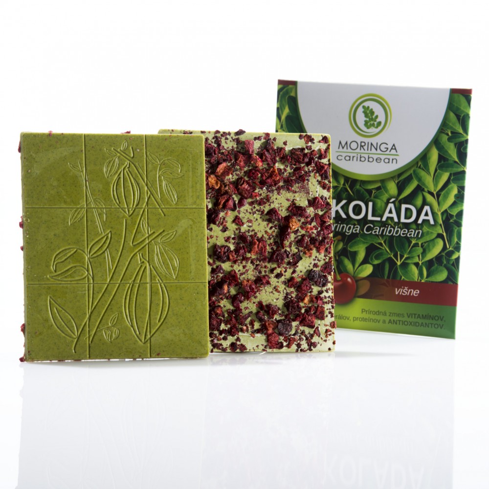 Unikátní zelená čokoláda s Moringa Caribbean a kousky lyofilizovaných višní. Mlsejte pro vaše zdraví nebo potěšte své blízké originální čokoládou.