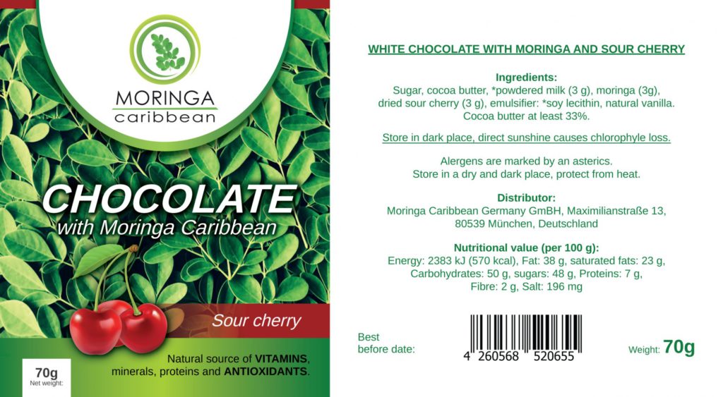 Základní receptura čokolády je inspirována bílou čokoládou, avšak s příměsí prášku z Moringa Caribbean je její konečná barva příjemně zelená. Na jedné straně plochy čokolády je vyražen dekorativní potisk, z druhé strany je lyofilizované ovoce ve formě drcených kousků, které krásně doplňují nejen celkový vzhled, ale i chuťový kontrast. Vhodná také jako originální dárek.