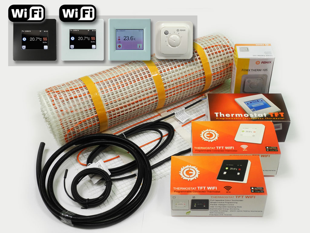 Sada Comfort Select 160 W/m2, pro svépomocnou instalaci - topná rohož + manuálně nastavitelný, programovatelný nebo WiFi termostat + podlahové čidlo + ochranná trubice,  podlahové topení do koupelny, kuchyně..., především pro přerušované vytápění s rychlým ohřevem.