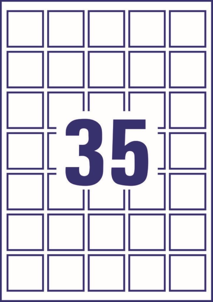 rozměr 35×35 mm, 10 archů A4, 350 ks etiket v balení (35 ks/arch), papírové, permanentní lepidlo, barva bílá. Typ tiskárny: černobílá laserová, barevná laserová, inkoustová.