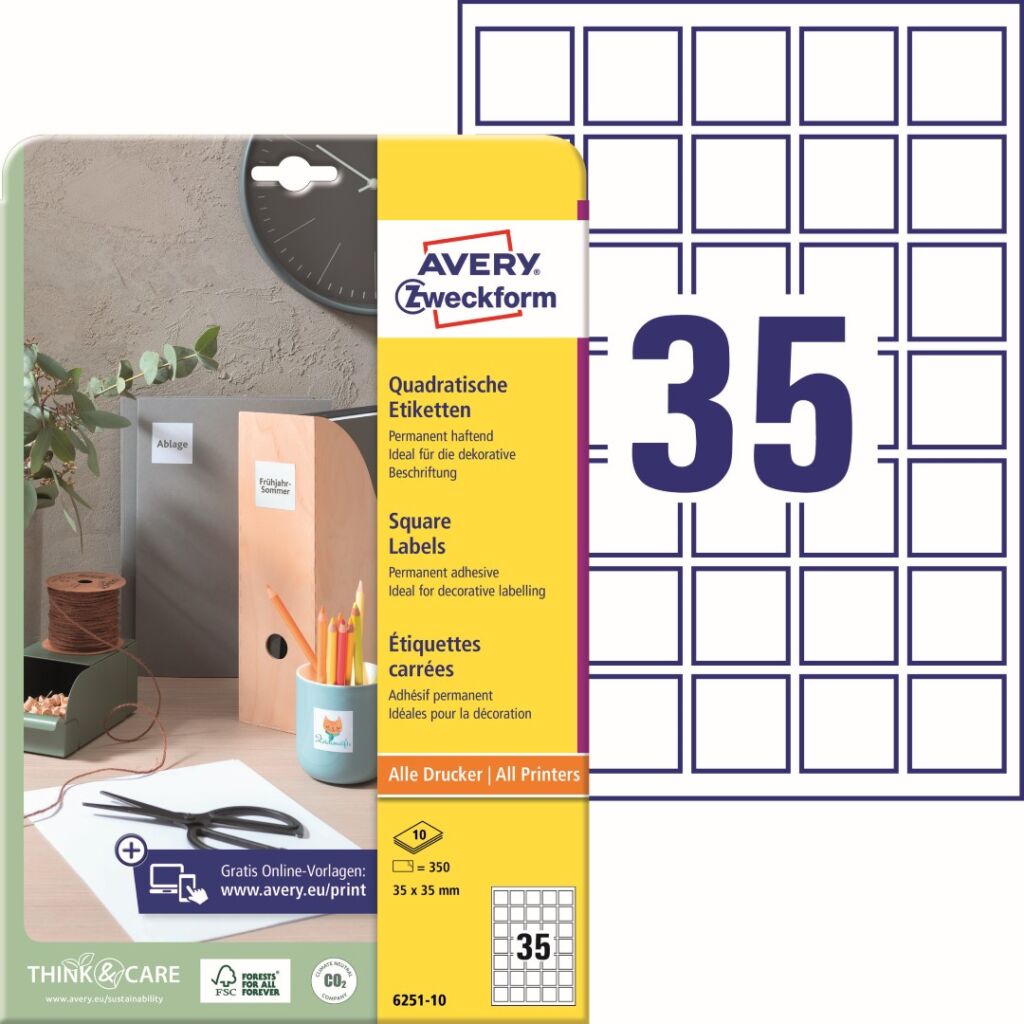 Čtvercové samolepící etikety Avery Zweckform 6251-10 do kanceláře, obchodu i domácnosti, které vyniknou svým zvláštním tvarem a pomohou zdůraznit originalitu a jedinečnost. Vysoká a stálá lepivost na běžných površích jako je papír, karton, sklo nebo plast. Při tisku se můžete spolehnout na plynulý průjezd archů tiskárnou bez uvíznutí a ostrý tiskový výstup, který se díky vynikajícímu ukotvení tonerového prášku nebo inkoustu nerozmazává. Samozřejmostí je čtyřstranný bezpečnostní okraj QCT (Quattro Clean Technology), který zabraňuje vytékání a usazování lepidla v tiskárně. Samolepící etikety tvaru čtverce Avery 6251-10 jsou vhodné pro všechny běžné laserové i inkoustové tiskárny, kopírovací stroje a hodí se i pro psaní, resp. ruční popis.