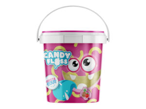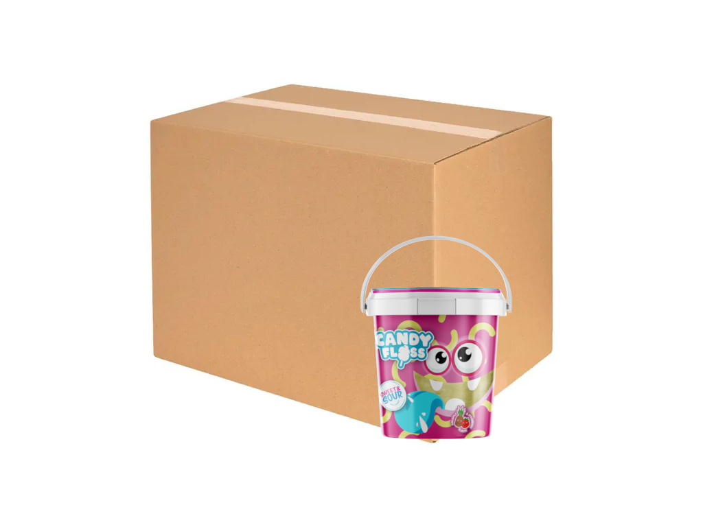 Sladko-kyselá barevná cukrová vata s příchutí kyselého ananasu a sladkých jahod, balení 18x850ml v plastovém kbelíku