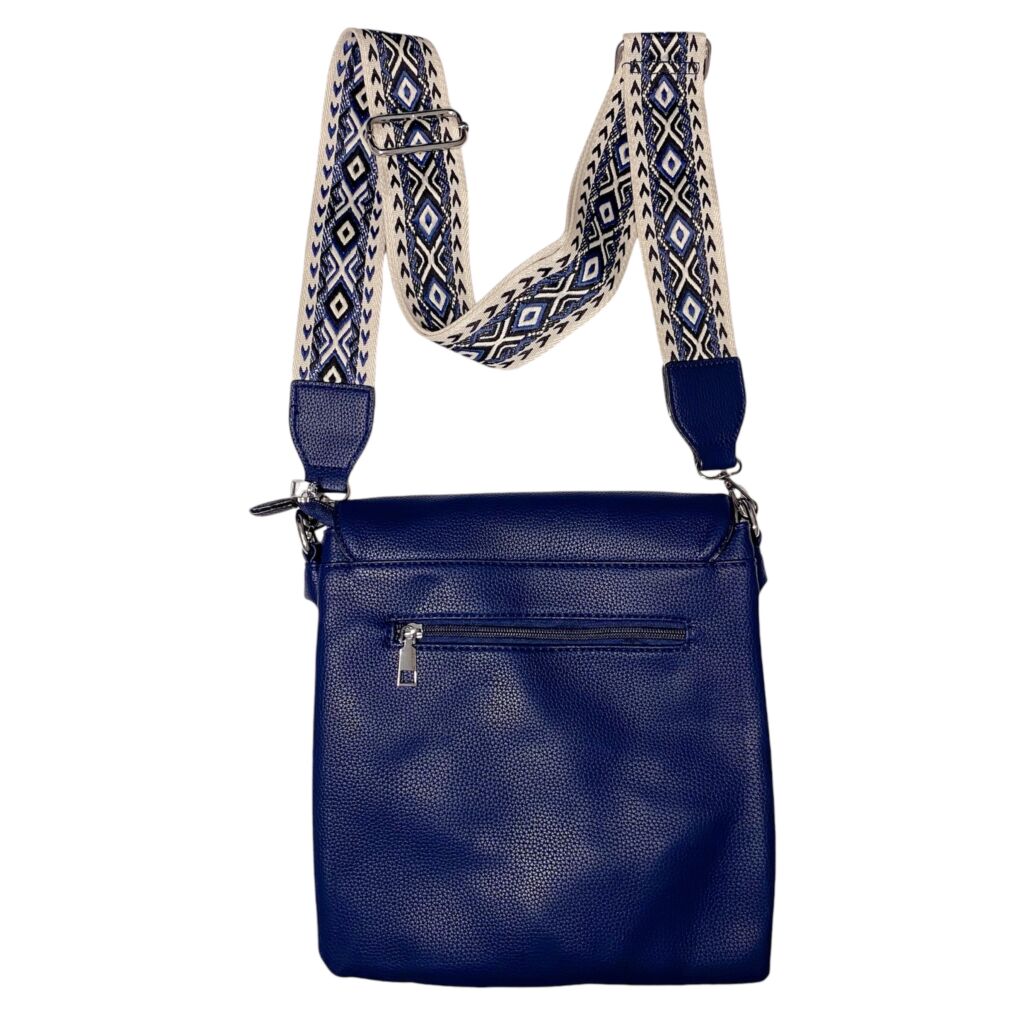 Na zadní straně kabelky se nachází další menší kapsa na zip, která poskytuje snadný přístup k vašim nezbytnostem. Kabelka je dodávána s dva typy popruhů: klasický popruh v barvě kabelky a širší popruh s krásným vzorováním, který je barevně sladěn s celkovým designem kabelky.