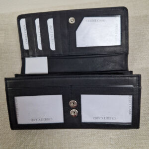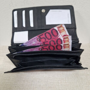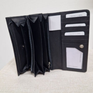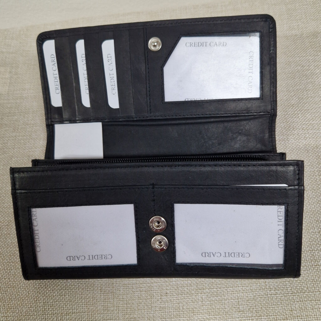 Materiál pravá kůže. Uvnitř peněženky, která má zapínání na druky, najdete celkem 9 přihrádek na karty a doklady, z toho 3 okýnka jsou průhledná, což je docela praktické. Dale je tu zapínací dvou-kapsa na drobné a vedle ní 3 velke přihrádky na bankovky, z nichž jedna ukrývá další vnitřní kapsu se zipem. Z venkovní strany se nachází ještě jedna větší otevřená kapsa. Rozměry peněženky jsou 18cm x 8,5cm x 2,9cm.