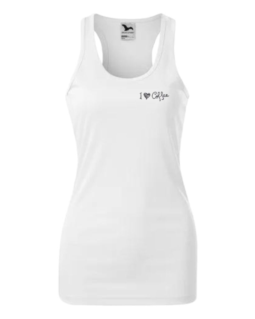 Bílé, projmuté tílko z lehoučkého materiálu je skvělé na léto i na sport. dejte všem vědět, že milujete kávu