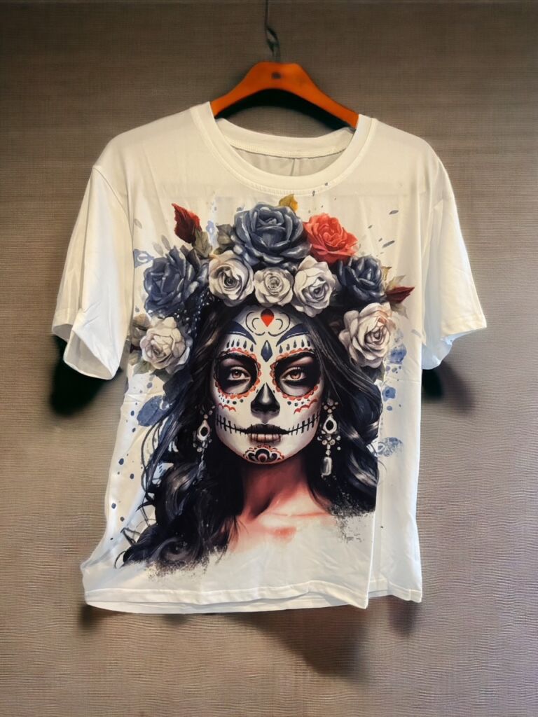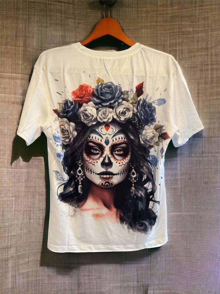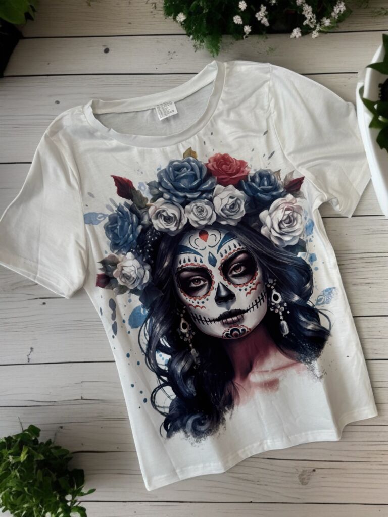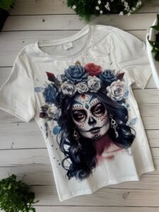 Bílé tričko s barevným potiskem sugar skull lebky. Super příjemný materiál