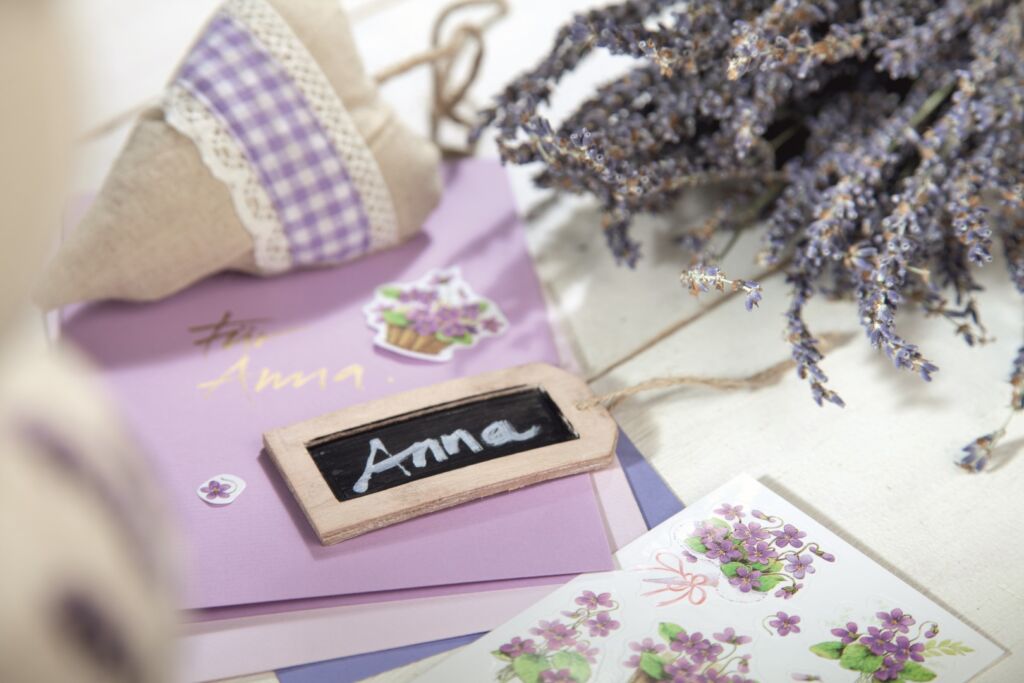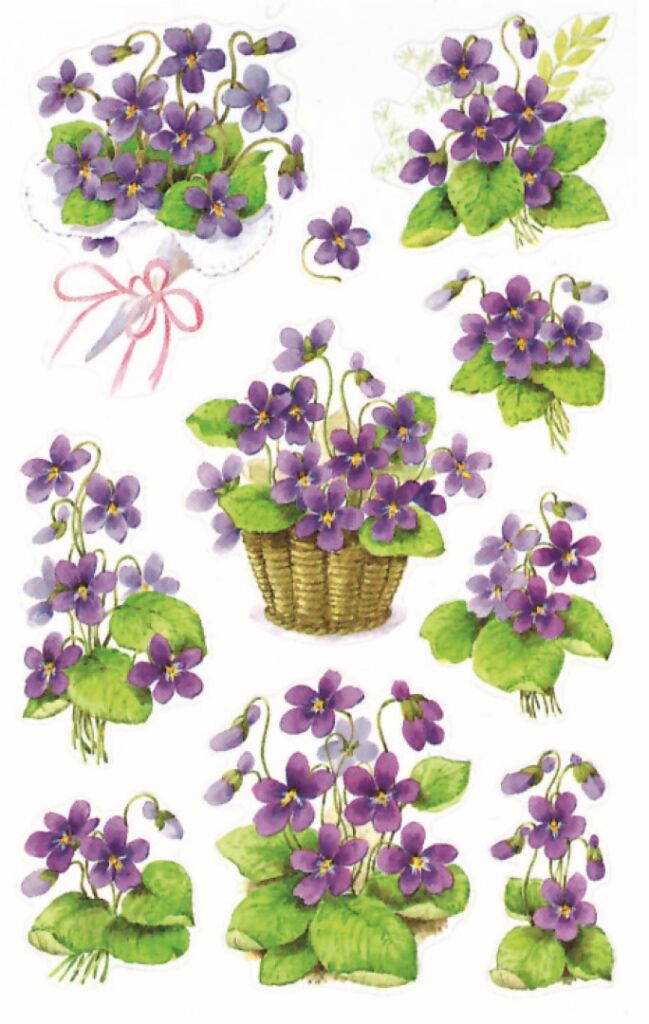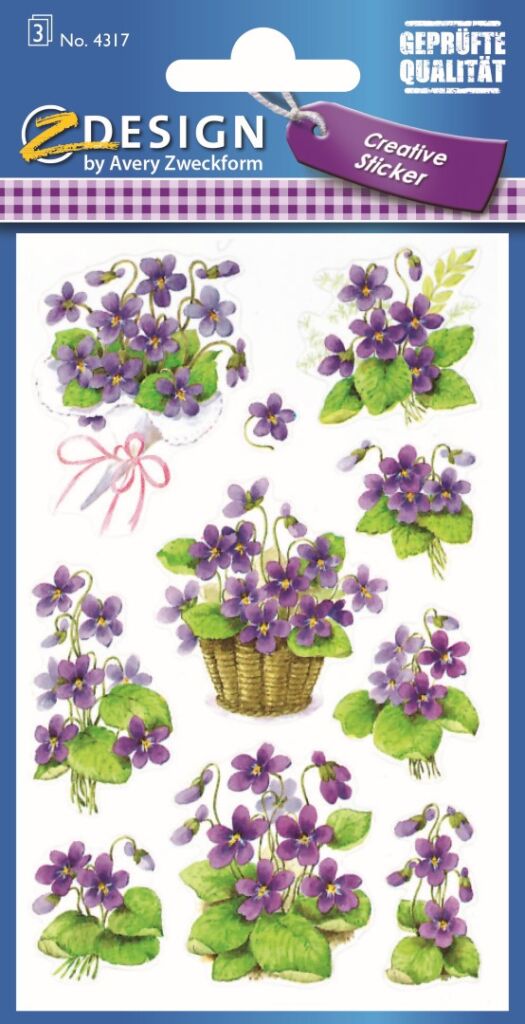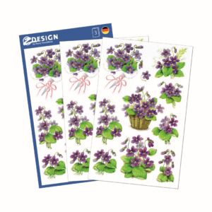 30 ks samolepek v balení, papírové, permanentní lepidlo, motiv fialky. Balení obsahuje 3 stejné aršíky vyobrazených samolepek.