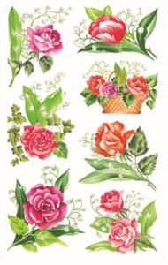 21 ks samolepek v balení, papírové, permanentní lepidlo, motiv růže. Balení obsahuje 3 stejné aršíky vyobrazených samolepek.