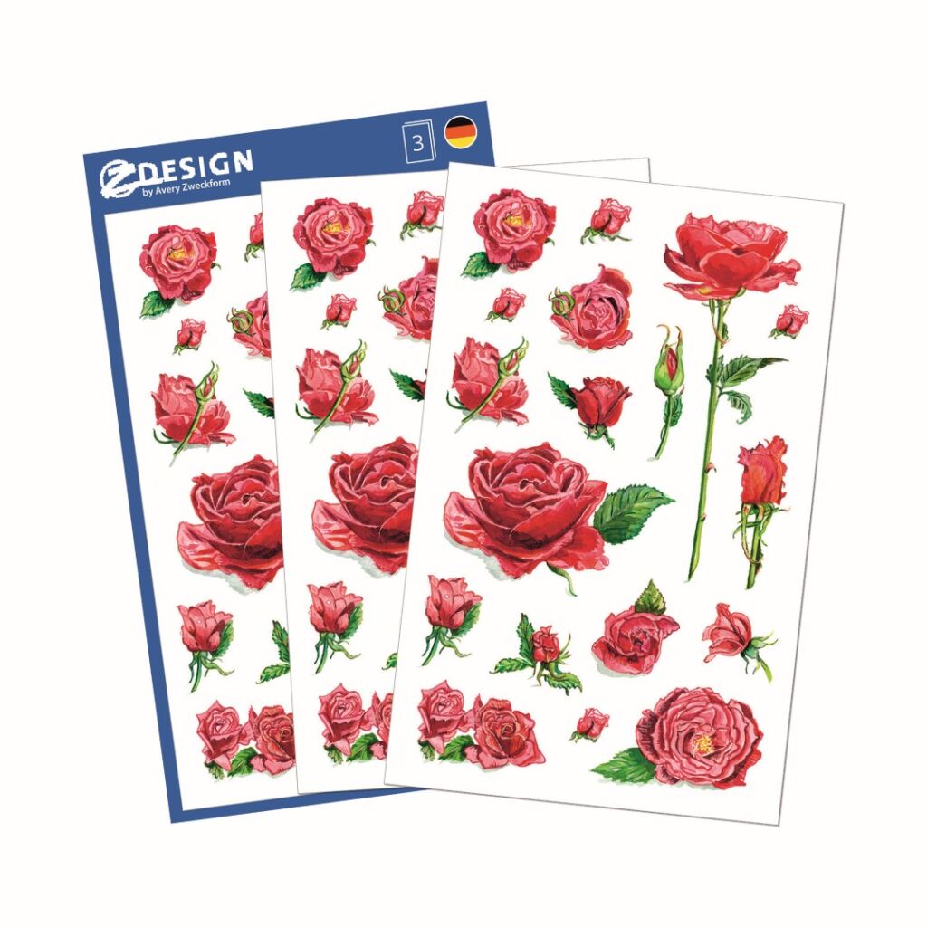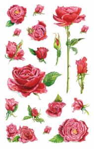 54 ks samolepek v balení, papírové, permanentní lepidlo, motiv růže. Balení obsahuje 3 stejné aršíky vyobrazených samolepek.