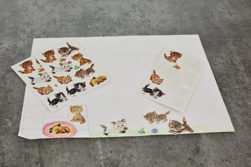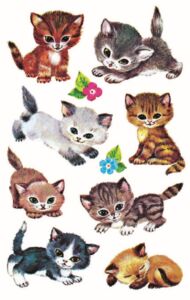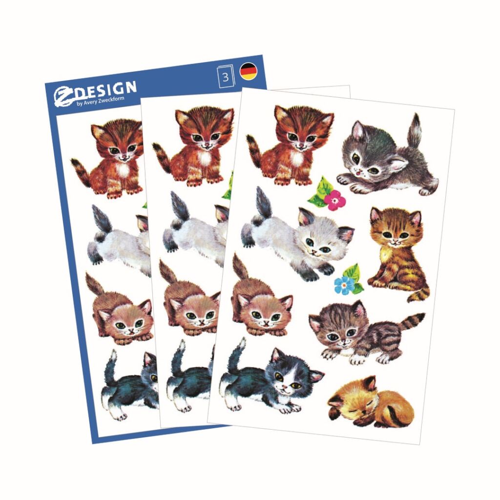 30 ks samolepek v balení, papírové, permanentní lepidlo, motiv koťata. Balení obsahuje 3 stejné aršíky vyobrazených samolepek.
