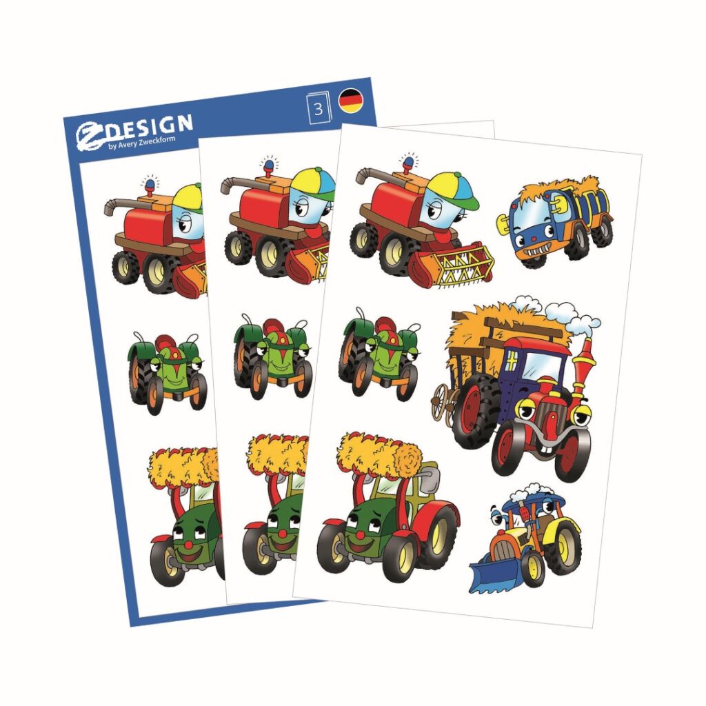 18 ks samolepek v balení, papírové, permanentní lepidlo, motiv zemědělské stroje. Balení obsahuje 3 stejné aršíky vyobrazených samolepek.