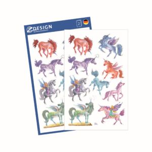 18 ks samolepek v balení, papírové, stříbrná reliéfní ražba, permanentní lepidlo, motiv jednorožci. Balení obsahuje 2 stejné aršíky vyobrazených samolepek.