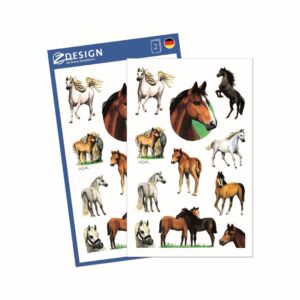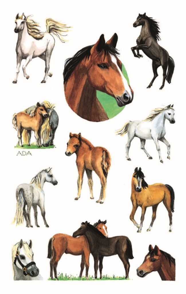22 ks samolepek v balení, papírové, permanentní lepidlo, motiv koně. Balení obsahuje 2 stejné aršíky vyobrazených samolepek.