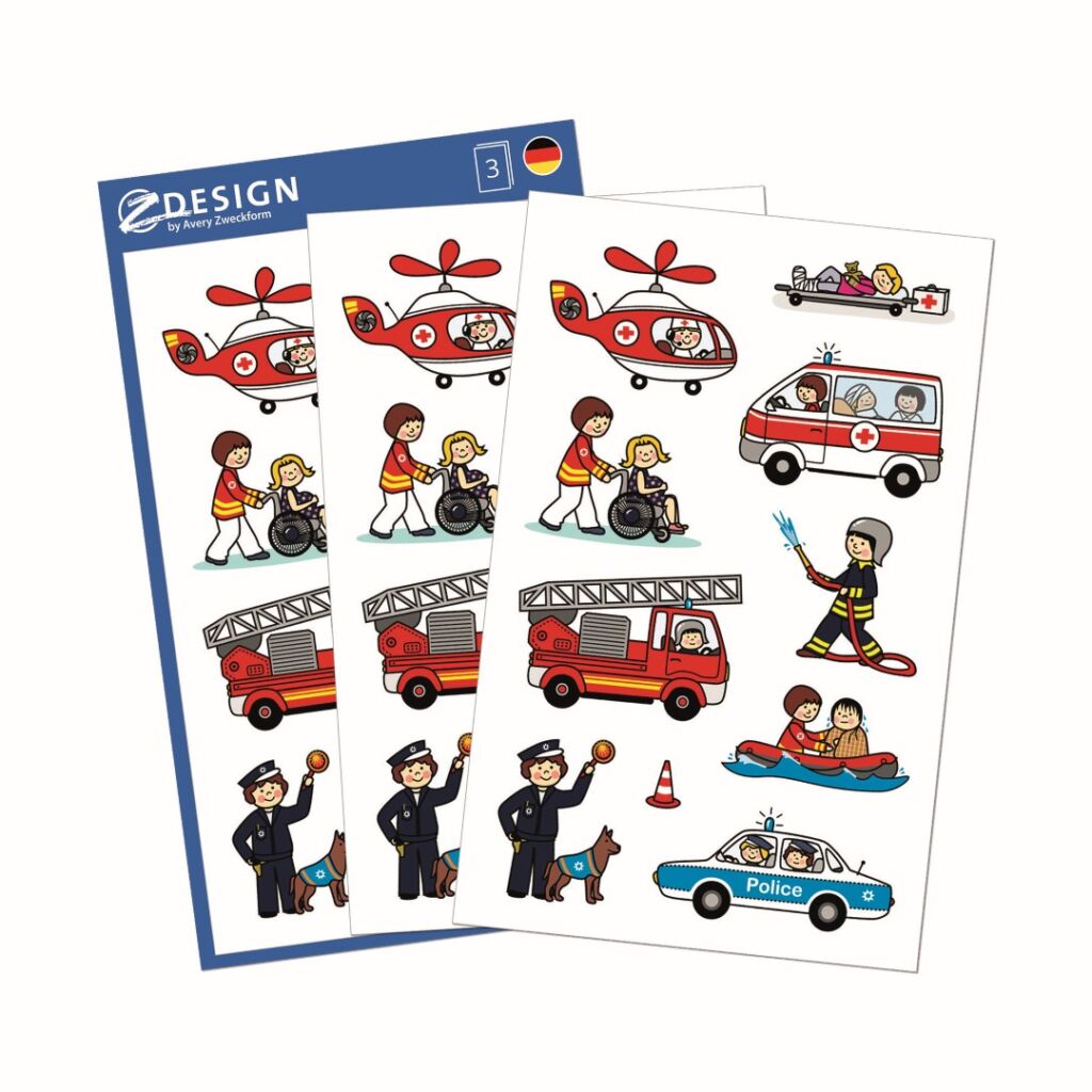 30 ks samolepek v balení, papírové, permanentní lepidlo, motiv záchranáři. Balení obsahuje 3 stejné aršíky vyobrazených samolepek.