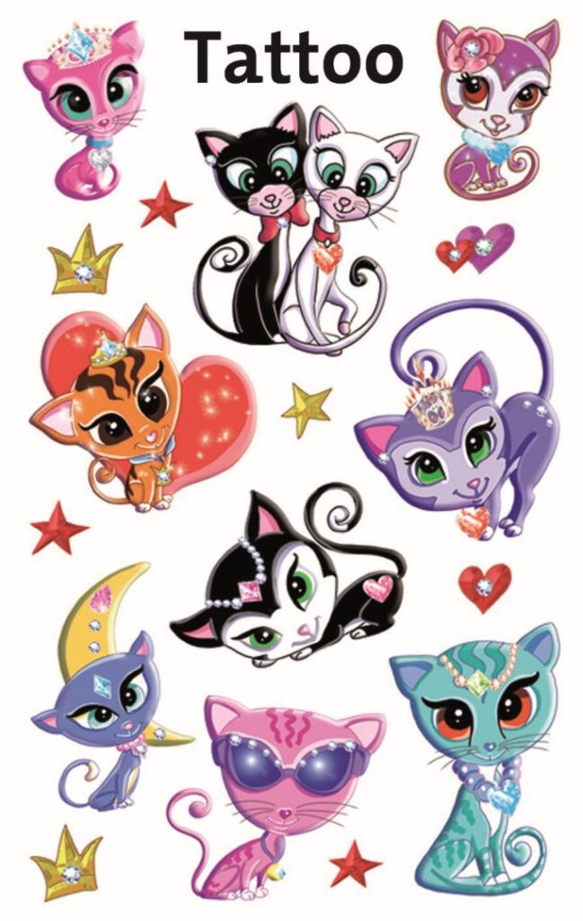 17 ks tetování v balení, tetovací fólie, motiv kočky. Dočasné, nedráždivé, voděodolné tetování na kůži. Balení obsahuje 1 aršík vyobrazených tetování.