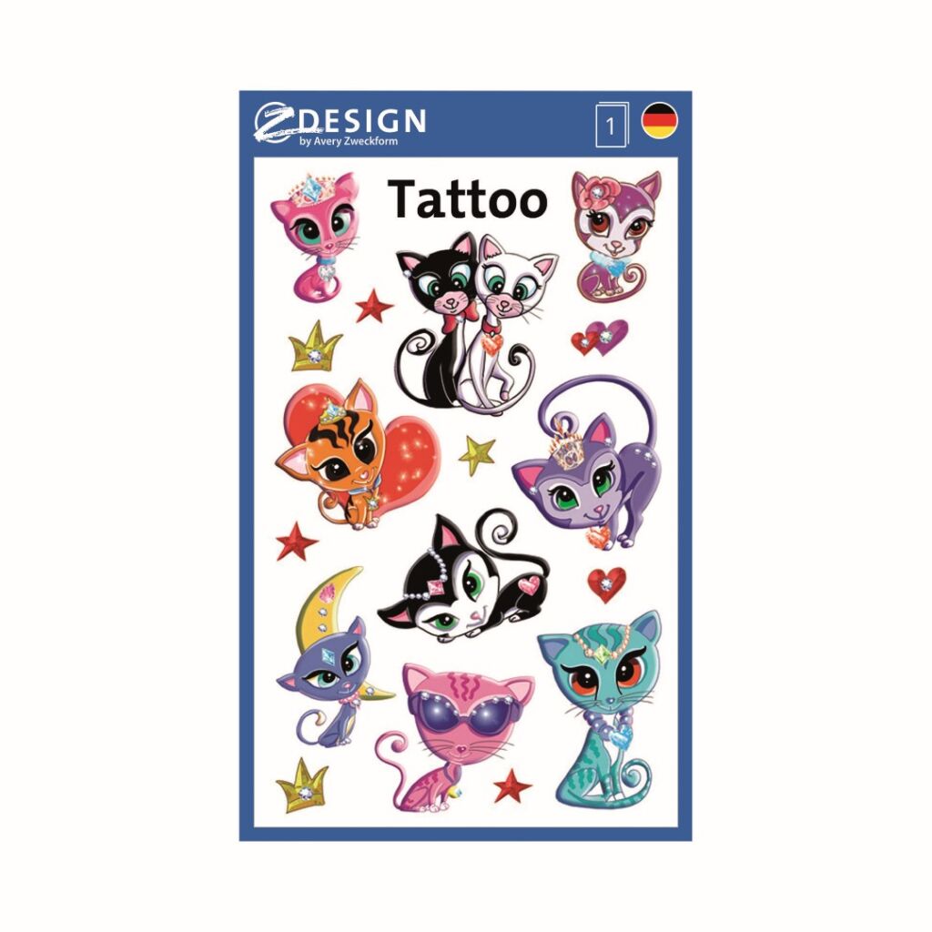Tetování pro malé i velké, pro holky i kluky, roztomilé, veselé ale i drsné a cool. V naší nabídce nejrůznějších motivů a symbolů si vybere každý. Tetování lze jednoduše aplikovat pomocí vody a lehce odstranit olejem. Tetovací fólie Avery Zweckform 56675 jsou samozřejmě dermatologicky testovány. Dětské tetování Z-design od Avery Zweckform nabízí prvotřídní a prověřenou kvalitu. Vyzkoušejte je a udělejte radost sobě nebo Vašim dětem!