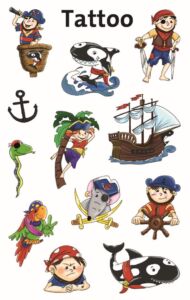 12 ks tetování v balení, tetovací fólie, motiv piráti. Dočasné, nedráždivé, voděodolné tetování na kůži. Balení obsahuje 1 aršík vyobrazených tetování.
