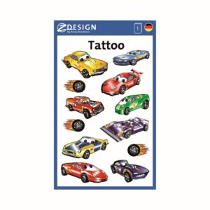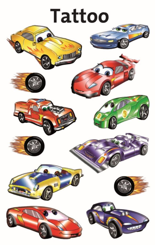 12 ks tetování v balení, tetovací fólie, motiv auta. Dočasné, nedráždivé, voděodolné tetování na kůži. Balení obsahuje 1 aršík vyobrazených tetování.