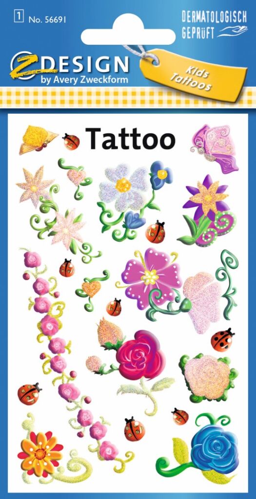 Tetování pro malé i velké, pro holky i kluky, roztomilé, veselé ale i drsné a cool. V naší nabídce nejrůznějších motivů a symbolů si vybere každý. Tetování lze jednoduše aplikovat pomocí vody a lehce odstranit olejem. Tetovací fólie Avery Zweckform 56691 jsou samozřejmě dermatologicky testovány. Dětské tetování Z-design od Avery Zweckform nabízí prvotřídní a prověřenou kvalitu. Vyzkoušejte je a udělejte radost sobě nebo Vašim dětem!