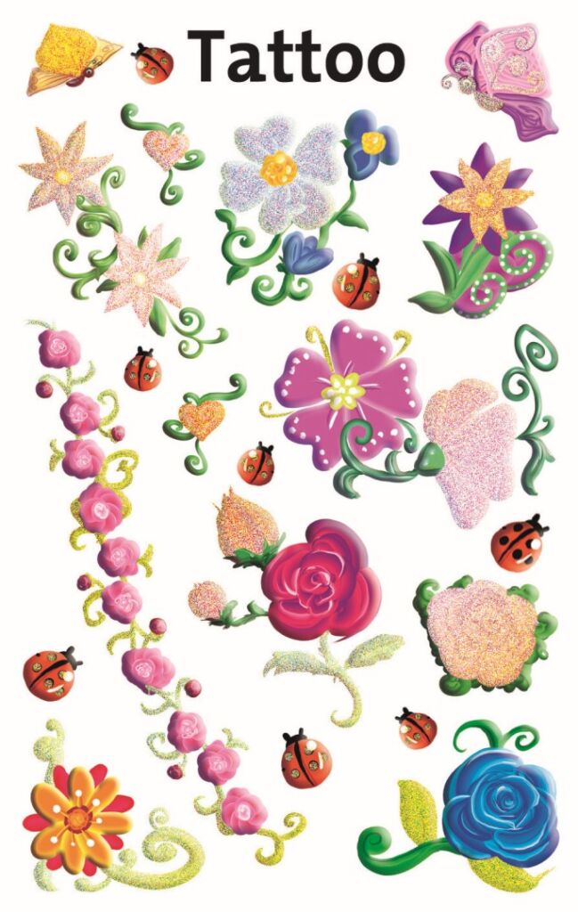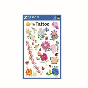 20 ks tetování v balení, tetovací fólie, motiv květiny. Dočasné, nedráždivé, voděodolné tetování na kůži. Balení obsahuje 1 aršík vyobrazených tetování.