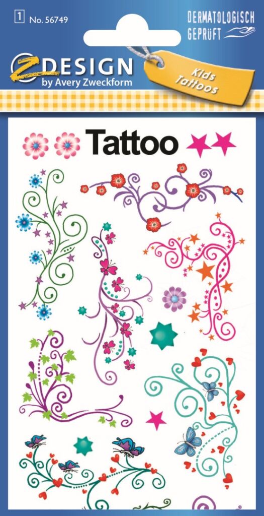 Tetování pro malé i velké, pro holky i kluky, roztomilé, veselé ale i drsné a cool. V naší nabídce nejrůznějších motivů a symbolů si vybere každý. Tetování lze jednoduše aplikovat pomocí vody a lehce odstranit olejem. Tetovací fólie Avery Zweckform 56749 jsou samozřejmě dermatologicky testovány. Dětské tetování Z-design od Avery Zweckform nabízí prvotřídní a prověřenou kvalitu. Vyzkoušejte je a udělejte radost sobě nebo Vašim dětem!