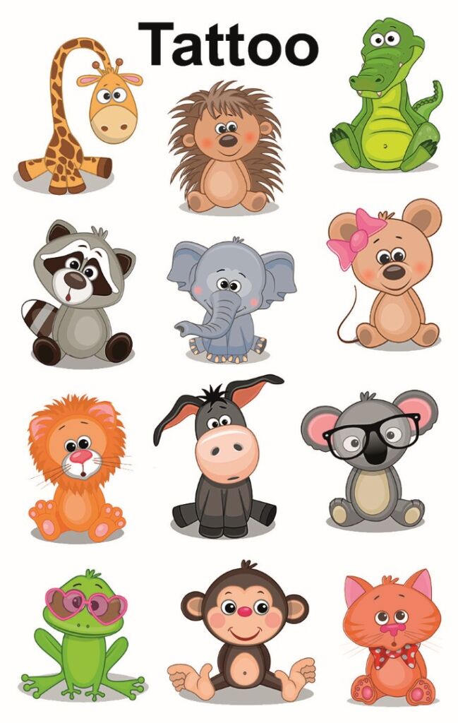 12 ks tetování v balení, tetovací fólie, motiv zvířata. Dočasné, nedráždivé, voděodolné tetování na kůži.
