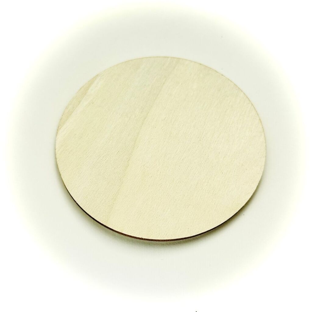 Dřevěný výřez z překližky ve tvaru kruhu o průměru 10 cm vhodný pro dekoraci a tvoření.