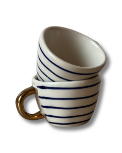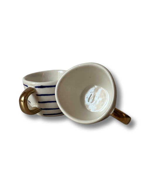 Luxusní geometrický espresso hrneček s modrým proužkem a se zlatým ouškem o objemu 100ml.