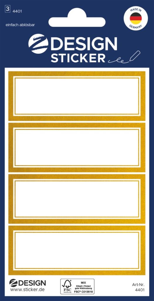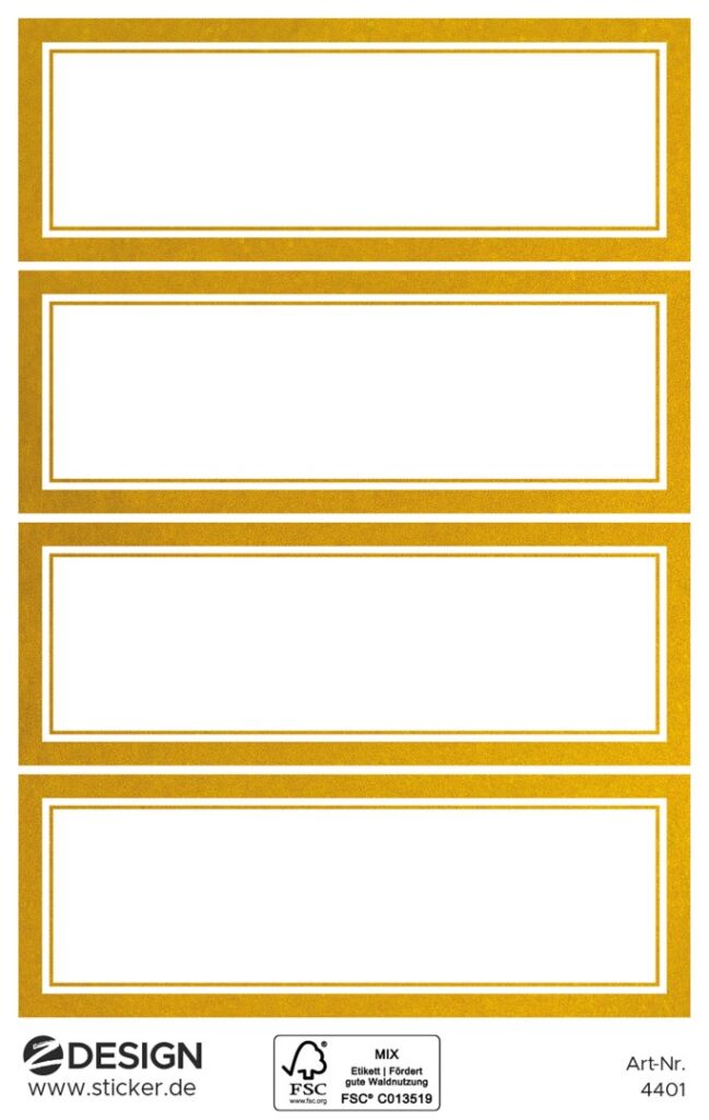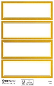 12 ks etiket v balení, papírové, snímatelné lepidlo, motiv rámečky se zlatým okrajem. Balení obsahuje 3 stejné aršíky vyobrazených samolepek.