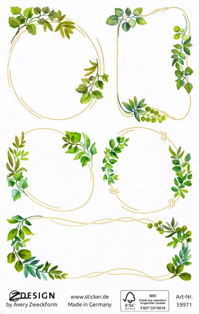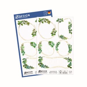 10 ks etiket v balení, papírové, zlatá reliéfní ražba, snímatelné lepidlo, motiv rámečky s lístky. Balení obsahuje 2 stejné aršíky vyobrazených samolepek.