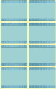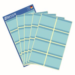 Rozměr 36×28 mm, 40 ks etiket v balení, papírové, permanentní lepidlo, barva světle modrá. Balení obsahuje 5 stejných aršíků vyobrazených samolepek.