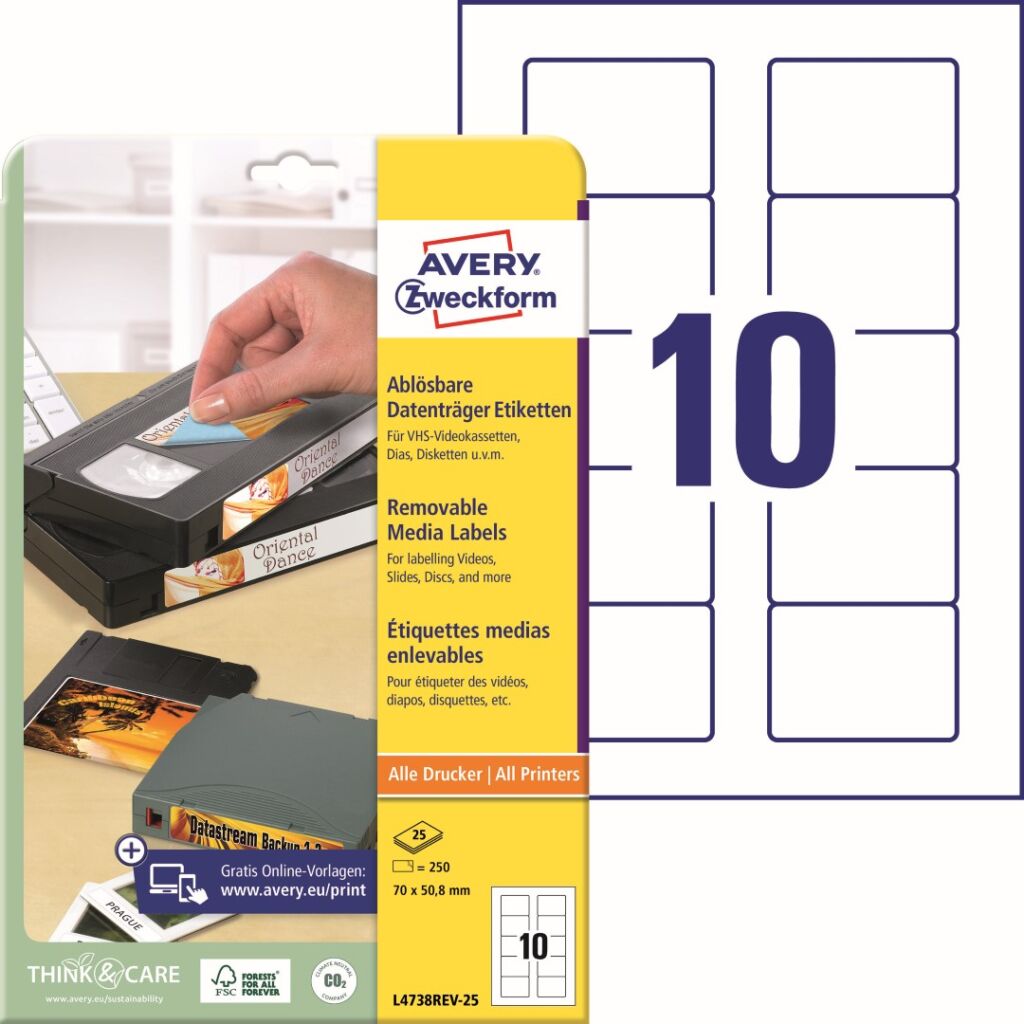 Odnímatelné etikety Avery Zweckform L4738REV-25 do kanceláře, obchodu i domácnosti, ideální na veškeré dočasné nebo měnící se značení. Přesně se hodí jako etikety na popis přední strany 3,5“ disket a obalů na MiniDisky. Etikety se snímatelným lepidlem spolehlivě a bezpečně drží, a naopak je lze snadno odlepit, bez zanechání žádných stop zbytkového lepidla. Ukázka viz Videa (záložka výše). Při tisku se můžete spolehnout na plynulý průjezd archů tiskárnou bez uvíznutí a ostrý tiskový výstup, který se díky vynikajícímu přilnutí tonerového prášku či inkoustu nerozmazává. Samozřejmostí je čtyřstranný bezpečnostní okraj QCT (Quattro Clean Technology), který zabraňuje vytékání a usazování lepidla v tiskárně. Samolepící etikety na datová média Avery Zweckform L4738REV-25 jsou vhodné pro všechny běžné laserové i inkoustové tiskárny, kopírovací stroje a hodí se i pro psaní, resp. ruční popis.