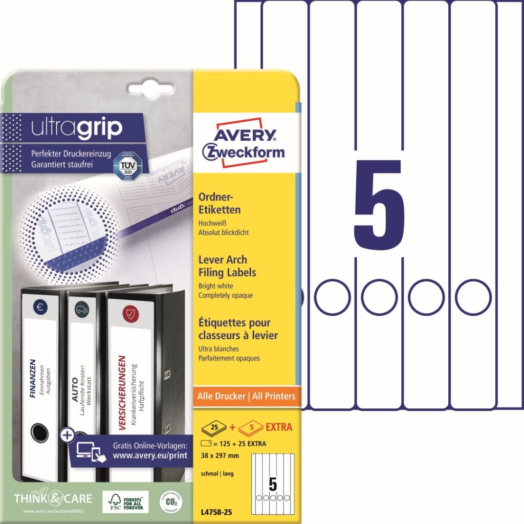 Samolepící etikety na pořadače Avery Zweckform L4758-25 dodají Vaší kanceláři jednotný vzhled, strukturu a řád. Potištěné hřbety pořadačů vypadají profesionálně, zjednoduší práci a ušetří čas při hledání dokumentů. Dlouhý formát je vhodný pro úzké pořadače značek Leitz, Elba, Esselte, Mehle, Herlitz, Bene atd. Etikety jsou 100% zcela neprůhledné a kompletně zakryjí starý text nebo etiketu. Novinka! Unikátní výrobní technologie Ultragrip – do oblasti záhlaví, zápatí a na boční okraje zadní strany archu s etiketami aplikovaná jemná vrstva laku a 3D strukturovaný povrch, který společně s vyznačenými okraji a vodícími linkami zaručí bezchybné natažení archu do tiskárny a absolutně přesný tisk bez rizika uvíznutí archu v tiskárně. Ukázka viz 2. Video (záložka výše). Při tisku se můžete spolehnout na čtyřstranný bezpečnostní okraj QCT (Quattro Clean Technology), který zabraňuje vytékání a usazování lepidla v tiskárně a ostrý tiskový výstup, který se díky vynikajícímu ukotvení tonerového prášku nebo inkoustu nerozmazává. Bezproblémový provoz laserových tiskáren testován a potvrzen certifikátem TÜV SÜD. Samolepící štítky na pořadače Avery Zweckform L4758-25 jsou vhodné pro všechny běžné laserové i inkoustové tiskárny, kopírovací stroje a hodí se i pro psaní, resp. ruční popis.