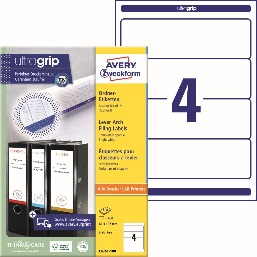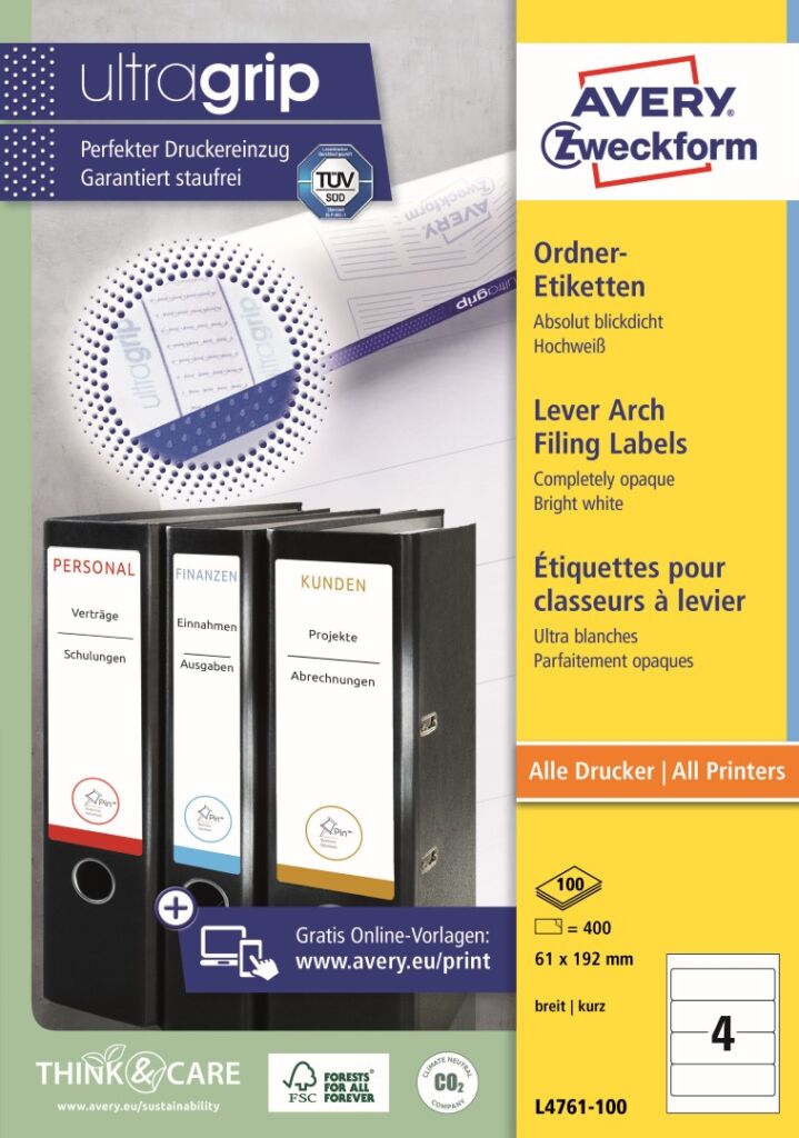 Samolepící etikety na pořadače Avery Zweckform L4761-100 dodají Vaší kanceláři jednotný vzhled, strukturu a řád. Potištěné hřbety pořadačů vypadají profesionálně, zjednoduší práci a ušetří čas při hledání dokumentů. Krátký formát je vhodný pro široké pořadače značek Leitz, Elba, Falken, Mehle, Bene, Biella atd. Etikety jsou 100% zcela neprůhledné a kompletně zakryjí starý text nebo etiketu. Novinka! Unikátní výrobní technologie Ultragrip – do oblasti záhlaví, zápatí a na boční okraje zadní strany archu s etiketami aplikovaná jemná vrstva laku a 3D strukturovaný povrch, který společně s vyznačenými okraji a vodícími linkami zaručí bezchybné natažení archu do tiskárny a absolutně přesný tisk bez rizika uvíznutí archu v tiskárně. Ukázka viz 2. Video (záložka výše). Při tisku se můžete spolehnout na čtyřstranný bezpečnostní okraj QCT (Quattro Clean Technology), který zabraňuje vytékání a usazování lepidla v tiskárně a ostrý tiskový výstup, který se díky vynikajícímu ukotvení tonerového prášku nebo inkoustu nerozmazává. Bezproblémový provoz laserových tiskáren testován a potvrzen certifikátem TÜV SÜD. Samolepící štítky na pořadače Avery Zweckform L4761-100 jsou vhodné pro všechny běžné laserové i inkoustové tiskárny, kopírovací stroje a hodí se i pro psaní, resp. ruční popis.