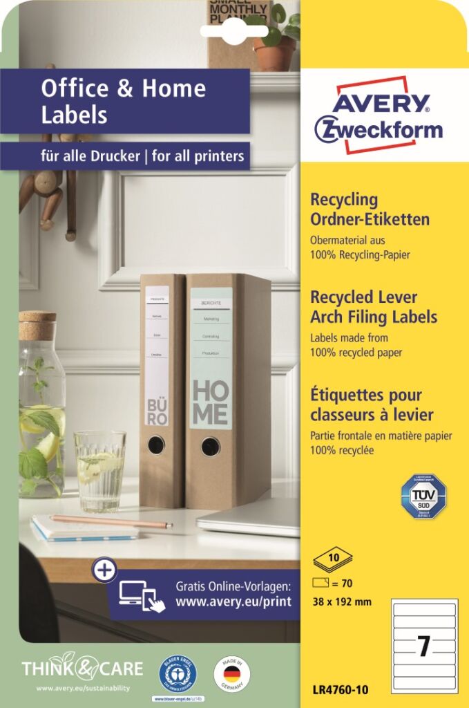Používejte produkty šetrné k životnímu prostředí! Recyklované etikety na pořadače Avery Zweckform LR4760-10 dodají Vaší kanceláři nebo domácí pracovně jednotný vzhled, strukturu a řád. Potištěné hřbety pořadačů vypadají profesionálně, zjednoduší práci a ušetří čas při hledání dokumentů. Krátký formát je vhodný pro úzké pořadače značek Leitz, Elba, Esselte, Mehle, Herlitz, Bene atd. Při tisku se můžete spolehnout na čtyřstranný bezpečnostní okraj QCT (Quattro Clean Technology), který zabraňuje vytékání a usazování lepidla v tiskárně a ostrý tiskový výstup, který se díky vynikajícímu ukotvení tonerového prášku nebo inkoustu nerozmazává. Bezproblémový provoz laserových tiskáren testován a potvrzen certifikátem TÜV SÜD. Recyklované štítky na pořadače Avery Zweckform LR4760-10 jsou vhodné pro všechny běžné laserové i inkoustové tiskárny, kopírovací stroje a hodí se i pro psaní, resp. ruční popis.