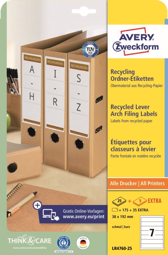 Používejte produkty šetrné k životnímu prostředí! Recyklované etikety na pořadače Avery Zweckform LR4760-25 dodají Vaší kanceláři jednotný vzhled, strukturu a řád. Potištěné hřbety pořadačů vypadají profesionálně, zjednoduší práci a ušetří čas při hledání dokumentů. Krátký formát je vhodný pro úzké pořadače značek Leitz, Elba, Esselte, Mehle, Herlitz, Bene atd. Při tisku se můžete spolehnout na čtyřstranný bezpečnostní okraj QCT (Quattro Clean Technology), který zabraňuje vytékání a usazování lepidla v tiskárně a ostrý tiskový výstup, který se díky vynikajícímu ukotvení tonerového prášku nebo inkoustu nerozmazává. Bezproblémový provoz laserových tiskáren testován a potvrzen certifikátem TÜV SÜD. Recyklované štítky na pořadače Avery Zweckform LR4760-25 jsou vhodné pro všechny běžné laserové i inkoustové tiskárny, kopírovací stroje a hodí se i pro psaní, resp. ruční popis.