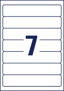 rozměr 38×192 mm, 30 archů A4, 210 ks etiket v balení (7 ks/arch), papírové, permanentní lepidlo, barva přírodní bílá. Typ tiskárny: černobílá laserová, barevná laserová, inkoustová.