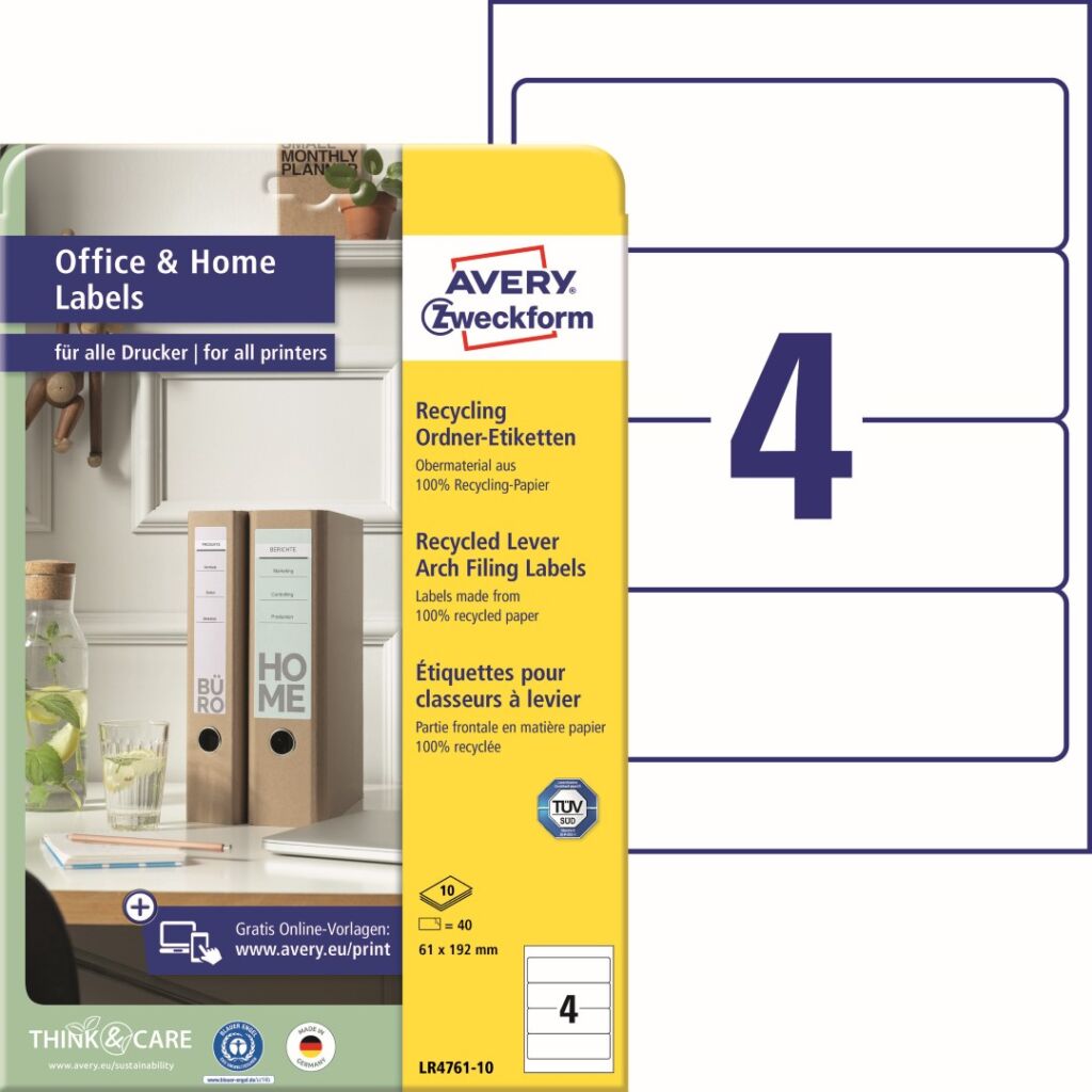 Používejte produkty šetrné k životnímu prostředí! Recyklované etikety na pořadače Avery Zweckform LR4761-10 dodají Vaší kanceláři nebo domácí pracovně jednotný vzhled, strukturu a řád. Potištěné hřbety pořadačů vypadají profesionálně, zjednoduší práci a ušetří čas při hledání dokumentů. Krátký formát je vhodný pro široké pořadače značek Leitz, Elba, Falken, Mehle, Bene, Biella atd. Novinka! Jedinečná výrobní technologie Ultragrip – do oblasti záhlaví a zápatí na přední straně archu s etiketami aplikovaný strukturovaný povrch zaručí bezchybné natažení archu do tiskárny a absolutně přesný tisk bez rizika uvíznutí archu v tiskárně. Ukázka viz 2. Video (záložka výše). Při tisku se můžete spolehnout na čtyřstranný bezpečnostní okraj QCT (Quattro Clean Technology), který zabraňuje vytékání a usazování lepidla v tiskárně a ostrý tiskový výstup, který se díky vynikajícímu ukotvení tonerového prášku nebo inkoustu nerozmazává. Bezproblémový provoz laserových tiskáren testován a potvrzen certifikátem TÜV SÜD. Recyklované samolepící štítky na pořadače Avery Zweckform LR4761-10 jsou vhodné pro všechny běžné laserové i inkoustové tiskárny, kopírovací stroje a hodí se i pro psaní, resp. ruční popis.