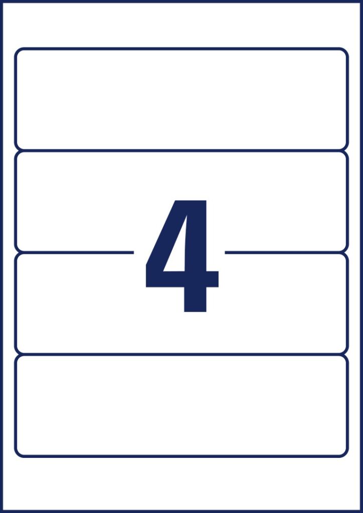 rozměr 61×192 mm, 10 archů A4, 40 ks etiket v balení (4 ks/arch), papírové, permanentní lepidlo, barva přírodní bílá. Typ tiskárny: černobílá laserová, barevná laserová, inkoustová.