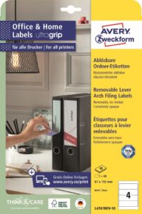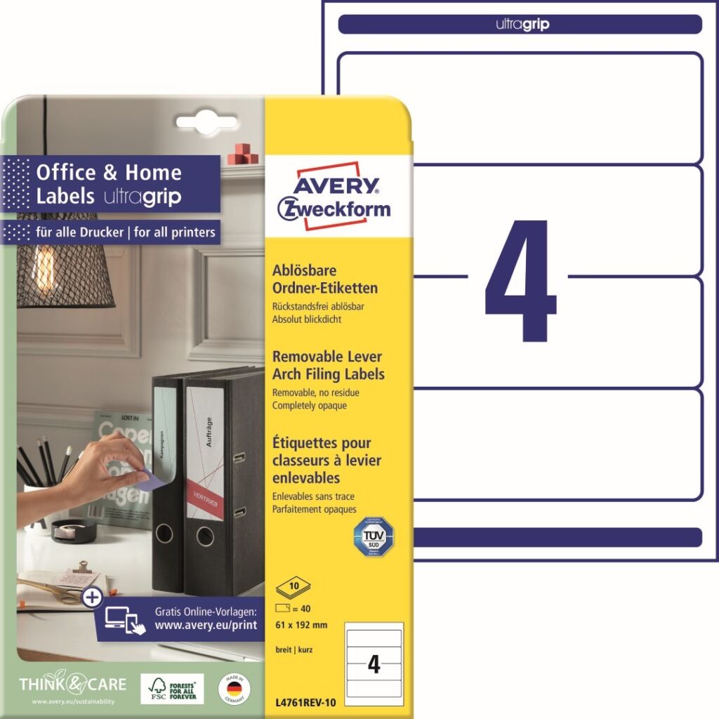 Snímatelné etikety na pořadače Avery Zweckform L4761REV-10 dodají Vaší kanceláři nebo domácí pracovně jednotný vzhled, strukturu a řád. Potištěné hřbety pořadačů vypadají profesionálně, zjednoduší práci a ušetří čas při hledání dokumentů. Krátký formát je vhodný pro široké pořadače značek Leitz, Elba, Falken, Mehle, Bene, Biella atd. Etikety jsou 100% zcela neprůhledné a kompletně zakryjí starý text nebo etiketu. Etikety se snímatelným lepidlem spolehlivě a bezpečně drží, a naopak je lze snadno odlepit, bez zanechání žádných stop zbytkového lepidla. Ukázka viz 1. Video (záložka výše). Novinka! Unikátní výrobní technologie Ultragrip – do oblasti záhlaví, zápatí a na boční okraje zadní strany archu s etiketami aplikovaná jemná vrstva laku a 3D strukturovaný povrch, který společně s vyznačenými okraji a vodícími linkami zaručí bezchybné natažení archu do tiskárny a absolutně přesný tisk bez rizika uvíznutí archu v tiskárně. Ukázka viz 2. Video (záložka výše). Při tisku se můžete spolehnout na čtyřstranný bezpečnostní okraj QCT (Quattro Clean Technology), který zabraňuje vytékání a usazování lepidla v tiskárně a ostrý tiskový výstup, který se díky vynikajícímu ukotvení tonerového prášku nebo inkoustu nerozmazává. Bezproblémový provoz laserových tiskáren testován a potvrzen certifikátem TÜV SÜD. Snímatelné štítky na pořadače Avery L4761REV-10 jsou vhodné pro všechny běžné laserové i inkoustové tiskárny, kopírovací stroje a hodí se i pro psaní, resp. ruční popis.